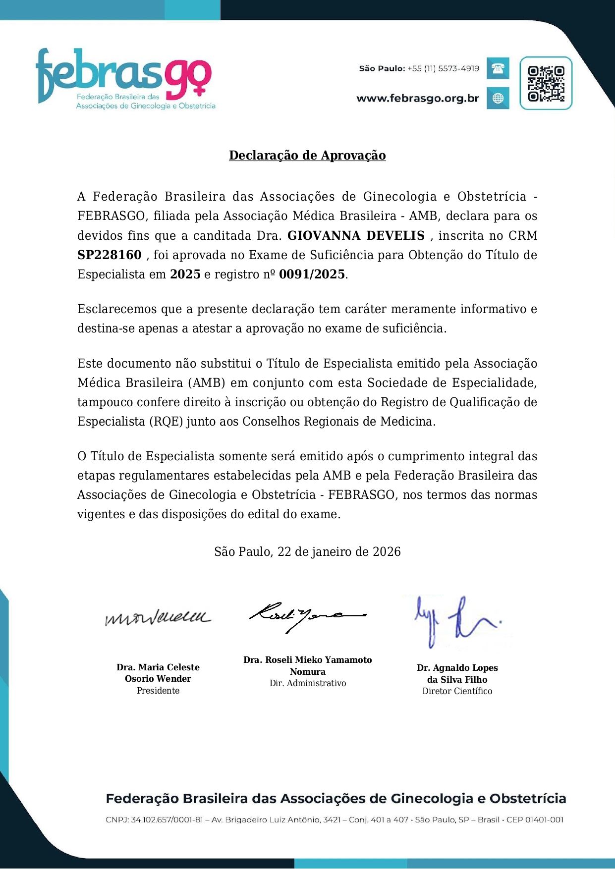 - Título de Especialista em Ginecologia e Obstetrícia pela FEBRASGO - 2025